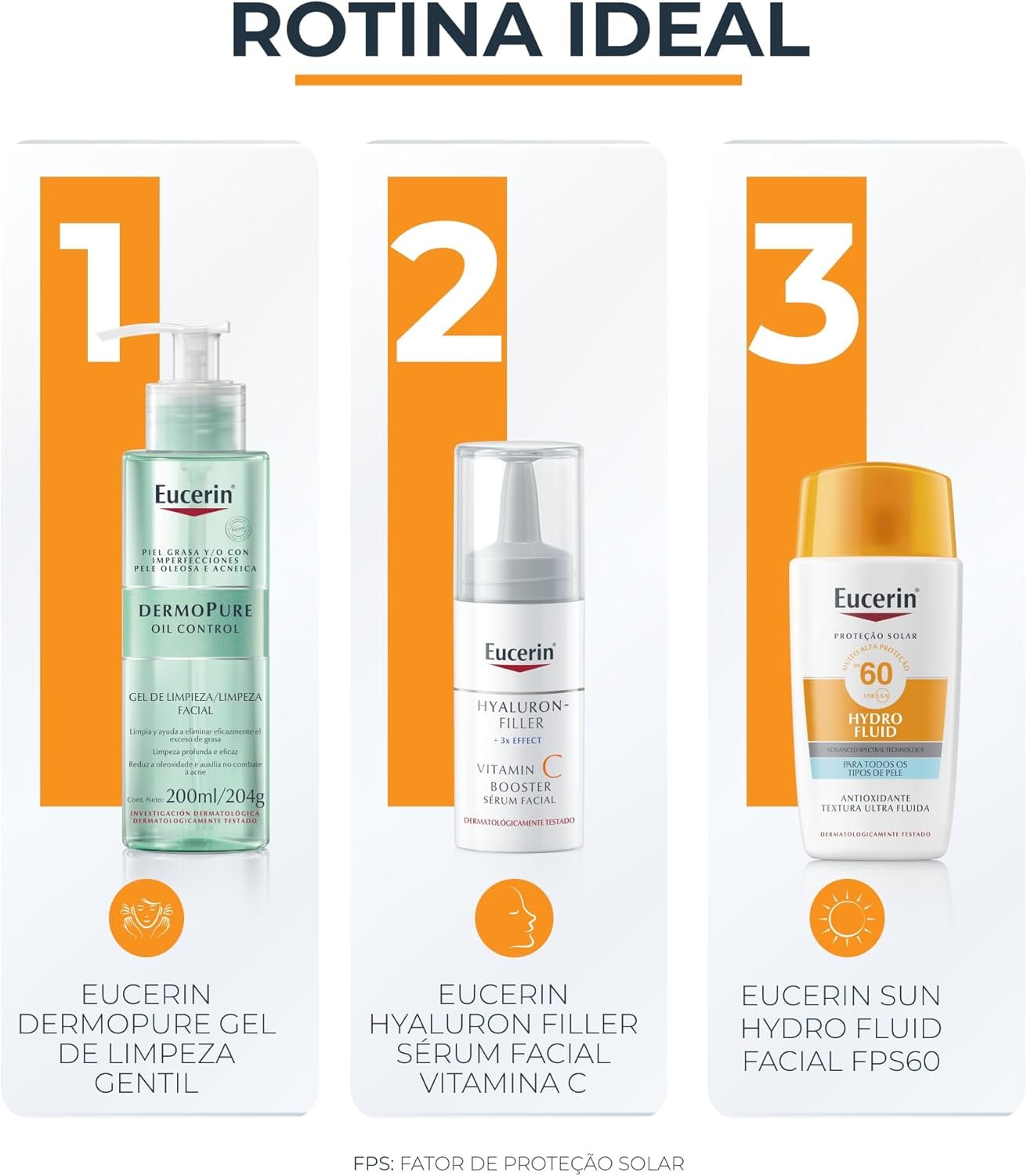 O Eucerin Hyaluron-Filler é um sérum facial que combina vitamina C pura e ácido hialurônico. Esses ingredientes têm propriedades conhecidas por promoverem uma pele mais suave e revitalizada. O produto é formulado para ser usado durante o dia e é adequado para todos os tipos de pele, incluindo as mais sensíveis.