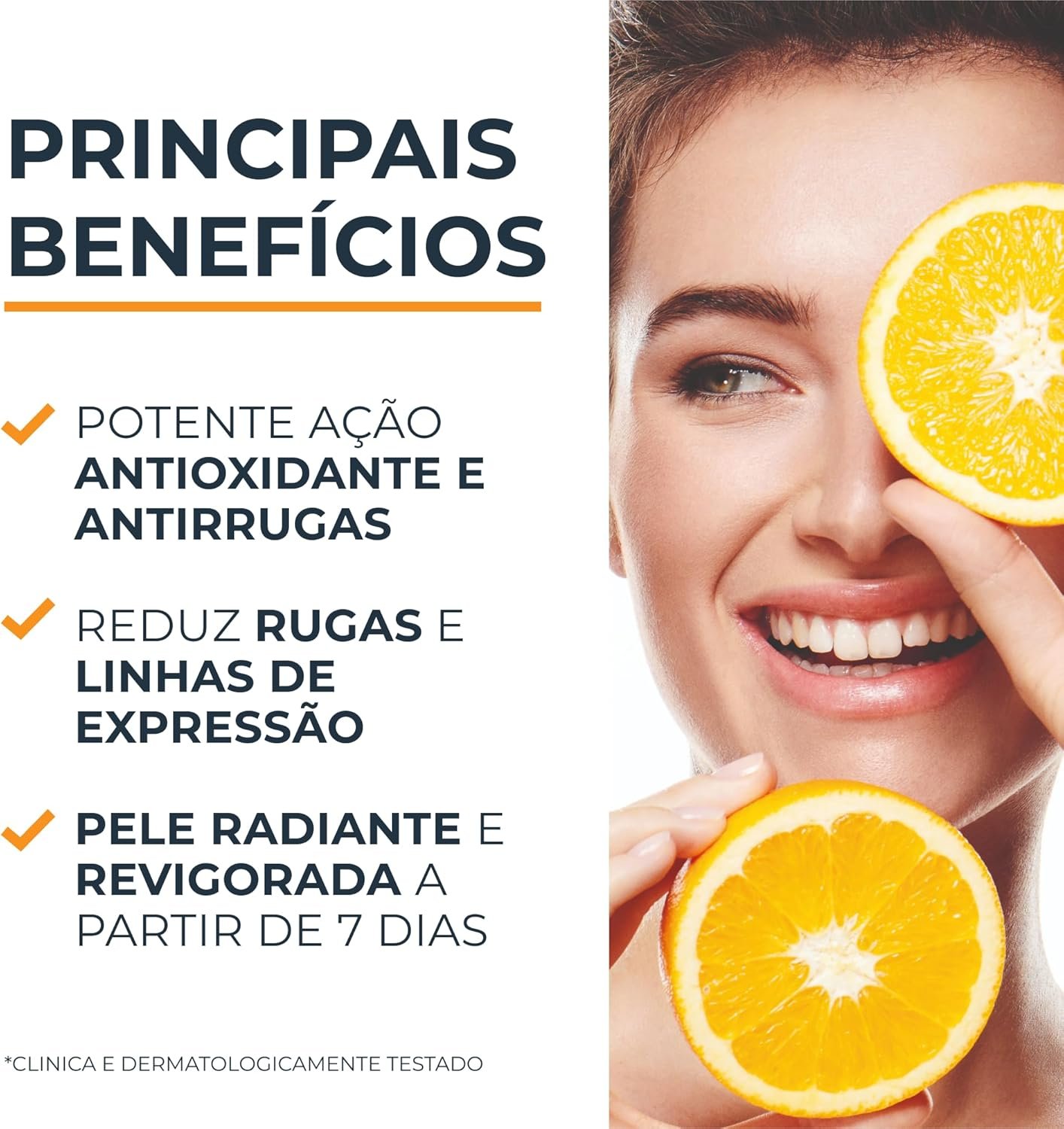 • Ação Antioxidante: A vitamina C é reconhecida por combater os radicais livres, ajudando a proteger a pele dos danos causados pelo ambiente.
