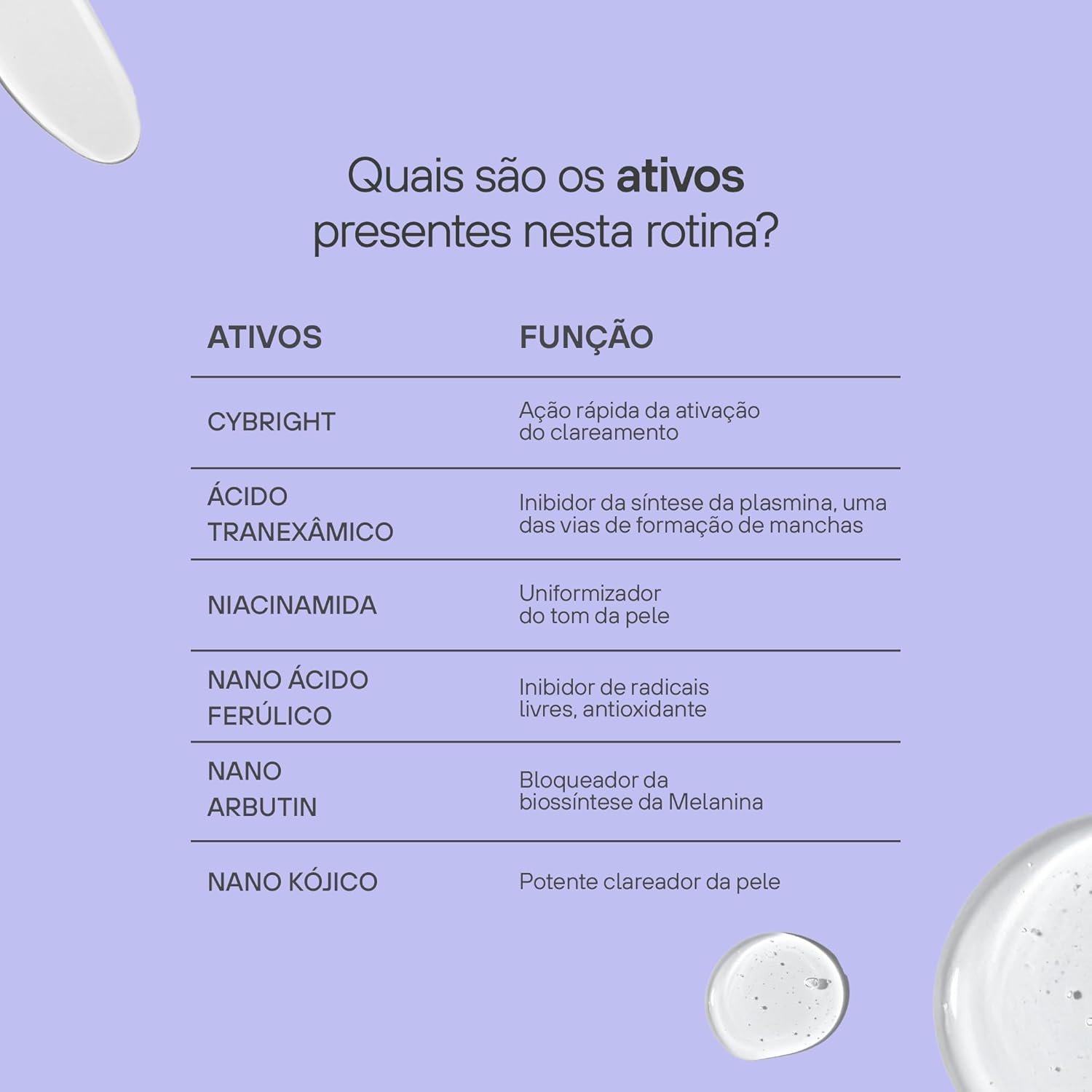 Cybright é conhecido por suas propriedades clareadoras e iluminadoras. Este ingrediente atua na redução de manchas e no tom irregular da pele, promovendo uma luminosidade saudável e natural.
