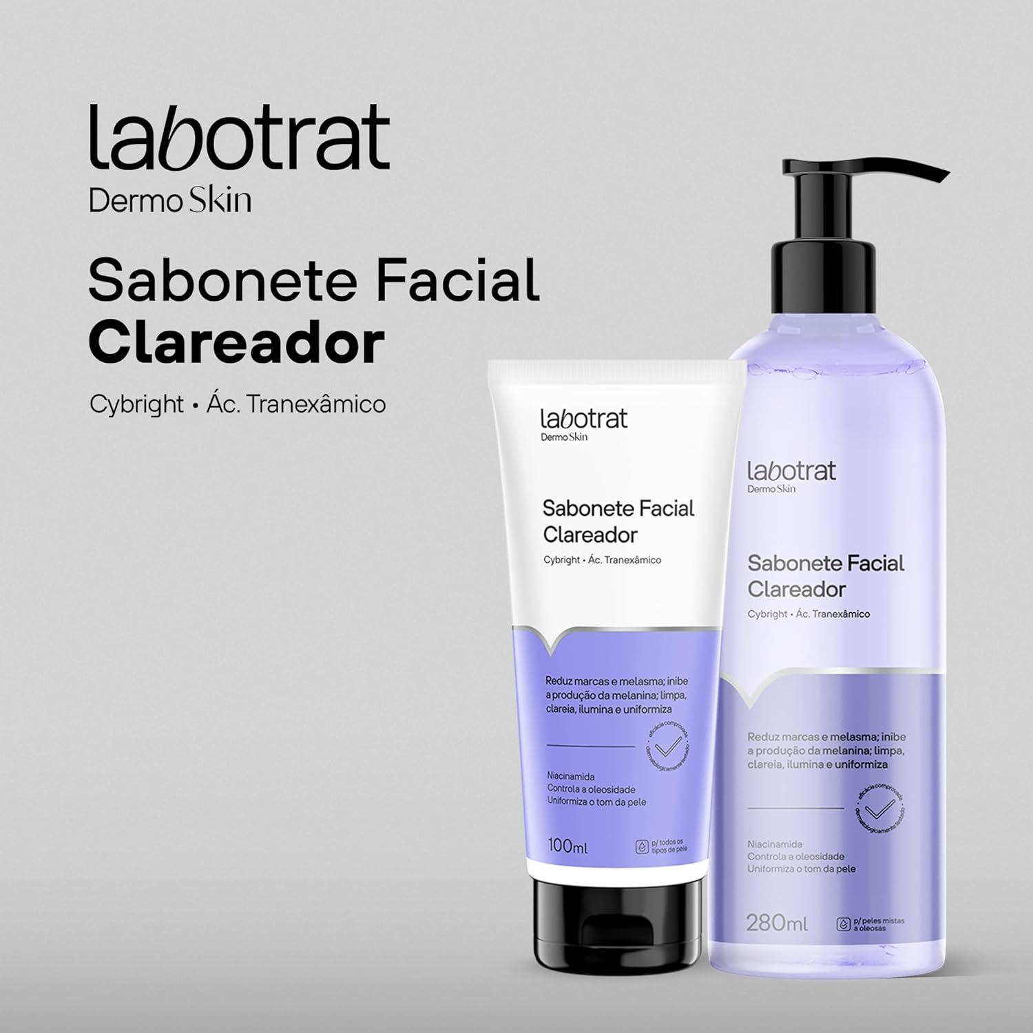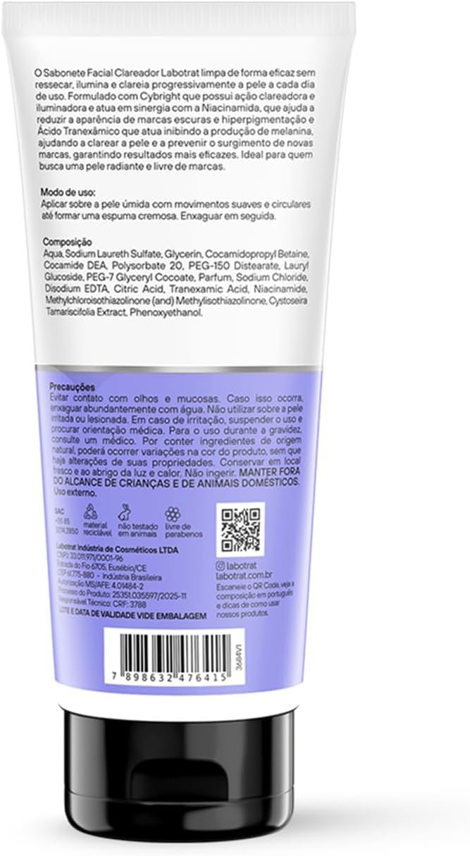 O Sabonete Facial Clareador Labotrat é um produto desenvolvido para limpar profundamente a pele sem causar ressecamento. A sua fórmula rica em ingredientes ativos como Cybright, Niacinamida e Ácido Tranexâmico não só promove uma limpeza eficaz, mas também atua na uniformização do tom da pele.