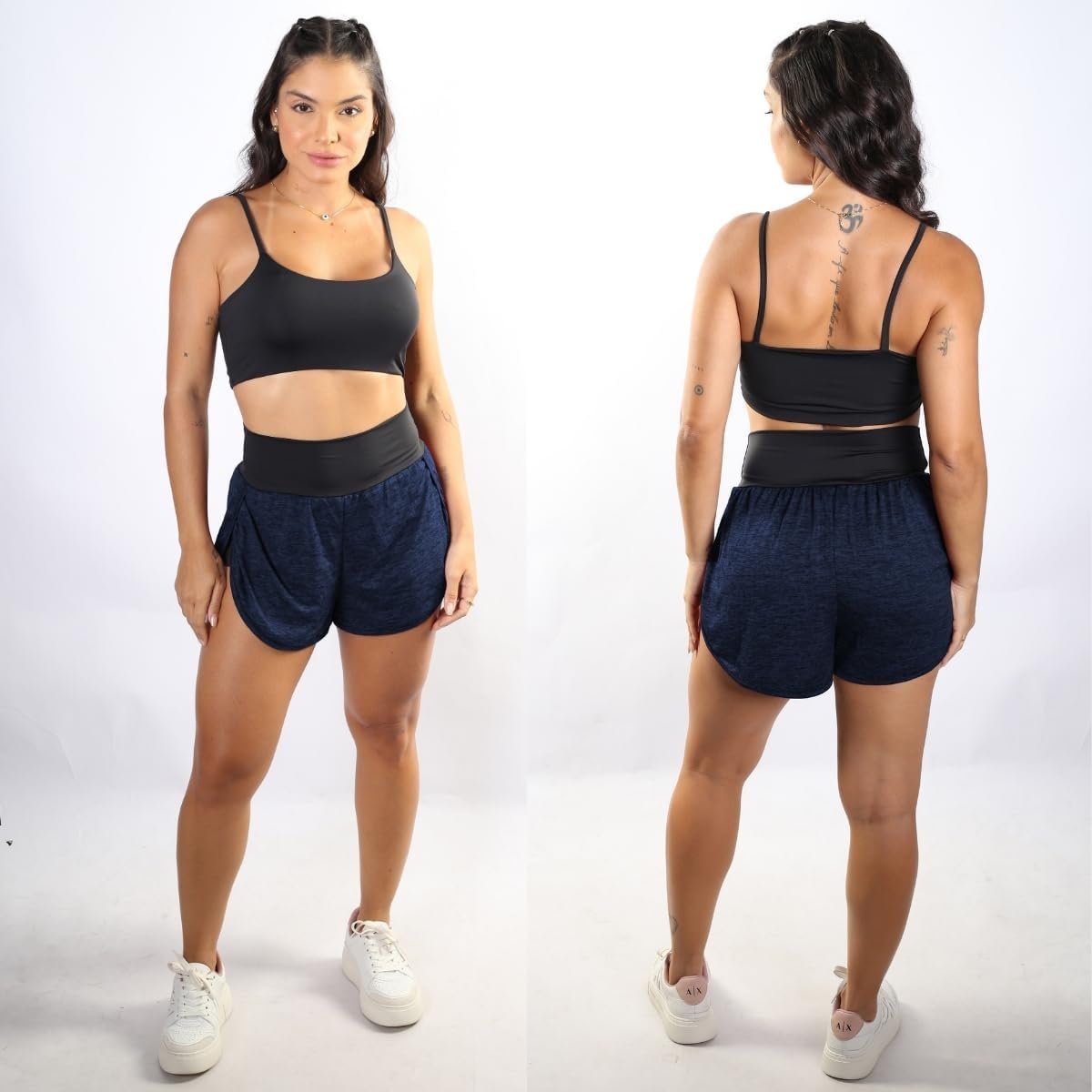 - Short: Cintura alta com bainhas arredondadas e aberturas laterais, acompanhado por forro interno para conforto adicional.