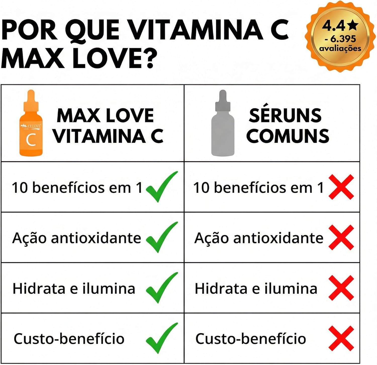 A avaliação dos consumidores é um dos pontos mais influentes na hora de decidir pela compra de um novo produto. Com 6.459 avaliações, o Max Love Serum Facial consegue manter uma média de 4,4 estrelas, demonstrando a satisfação de boa parte dos seus usuários.