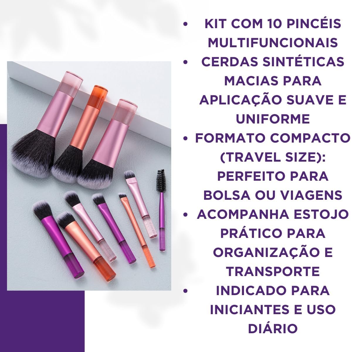 A beleza desse kit reside em seu design compacto e prático, que não compromete a qualidade dos pincéis. Ideal para quem está em movimento ou deseja otimizar o espaço na maquiagem na hora de viajar.