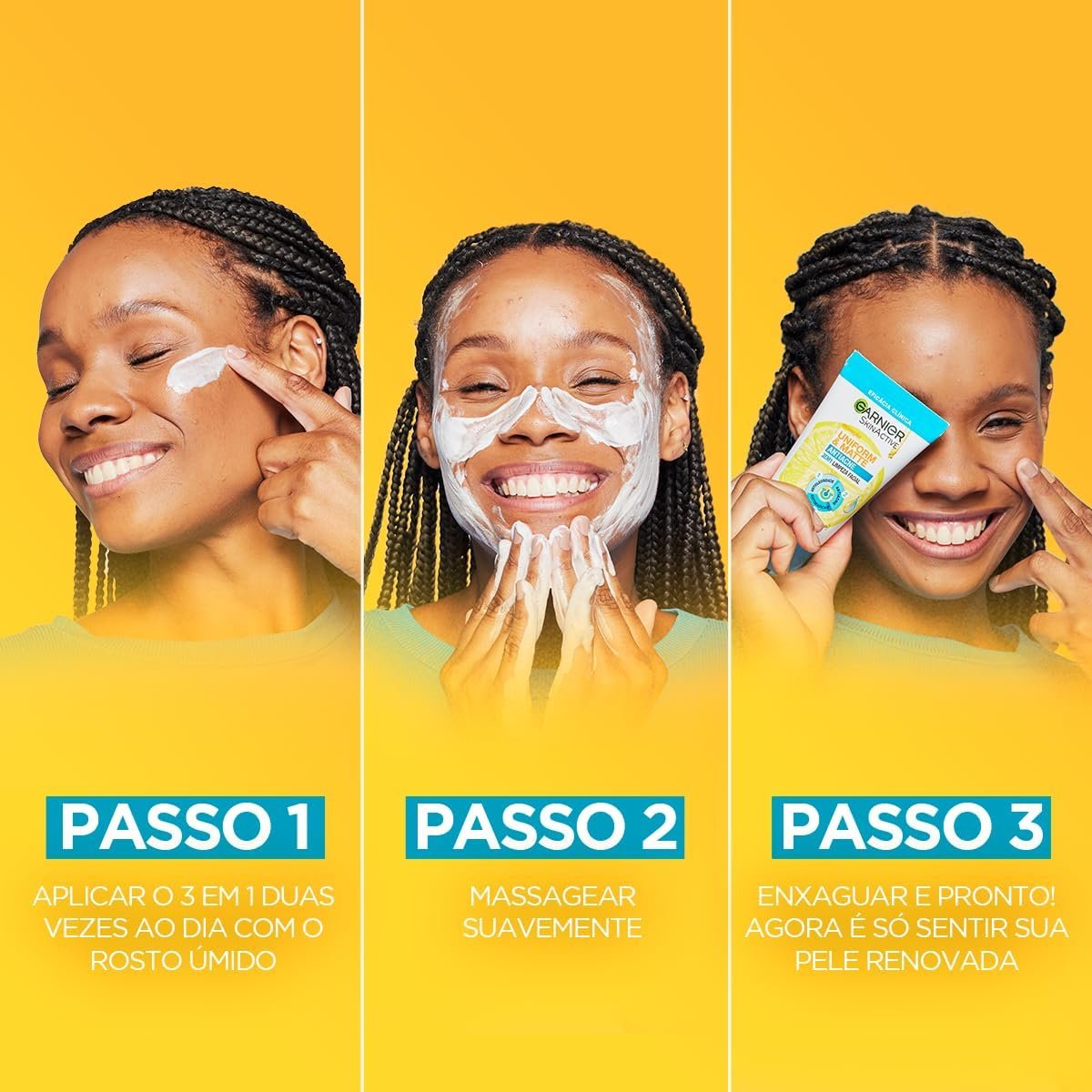 Estudos e avaliações de usuários indicam que a aplicação contínua do Sabonete Facial 3 em 1 Garnier proporciona: