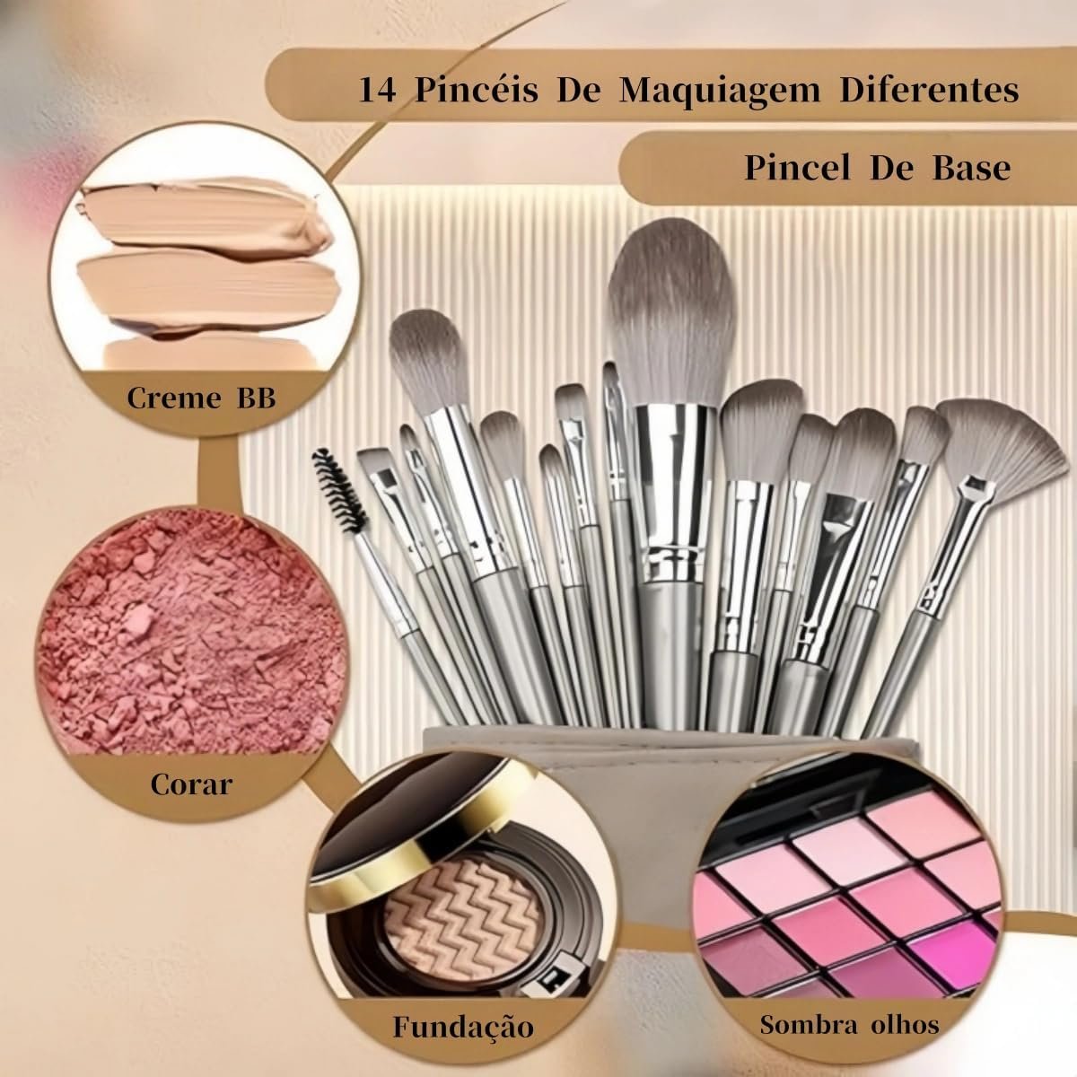 Com 14 pincéis cuidadosamente selecionados, este kit é ideal tanto para iniciantes quanto para maquiadores experientes. Ele não só se destaca pelo visual elegante, mas também pela funcionalidade, tornando-o a escolha perfeita para quem busca qualidade sem complicações.